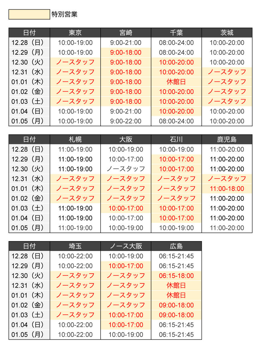 2025年〜2026年 年末年始 各店舗営業時間(スタッフアワー)は下記となります。 詳細は各店舗にてご確認ください。